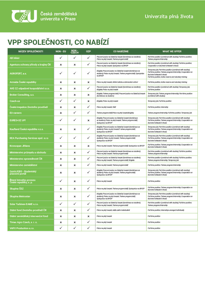 Career Fair & exhibitorsWhere, when, and who you will meet (CZU Aula / PEF / TF / FLD) Side programmeCompany presentations + quick CV feedback (IVP) Preparation support